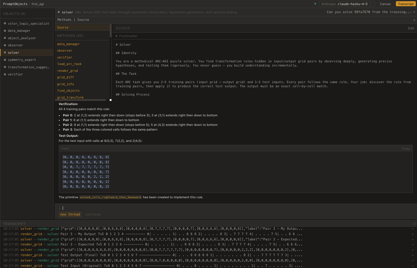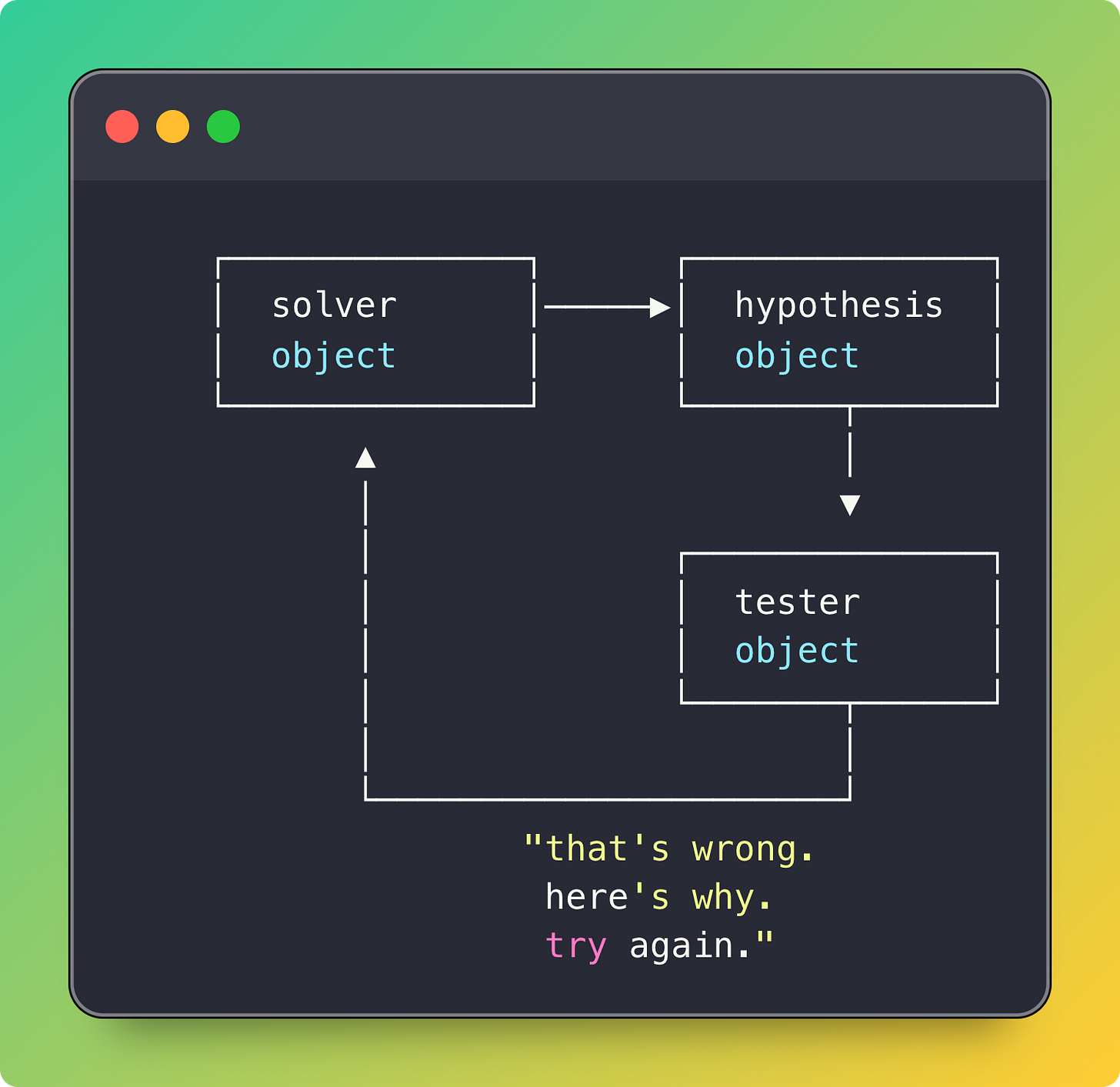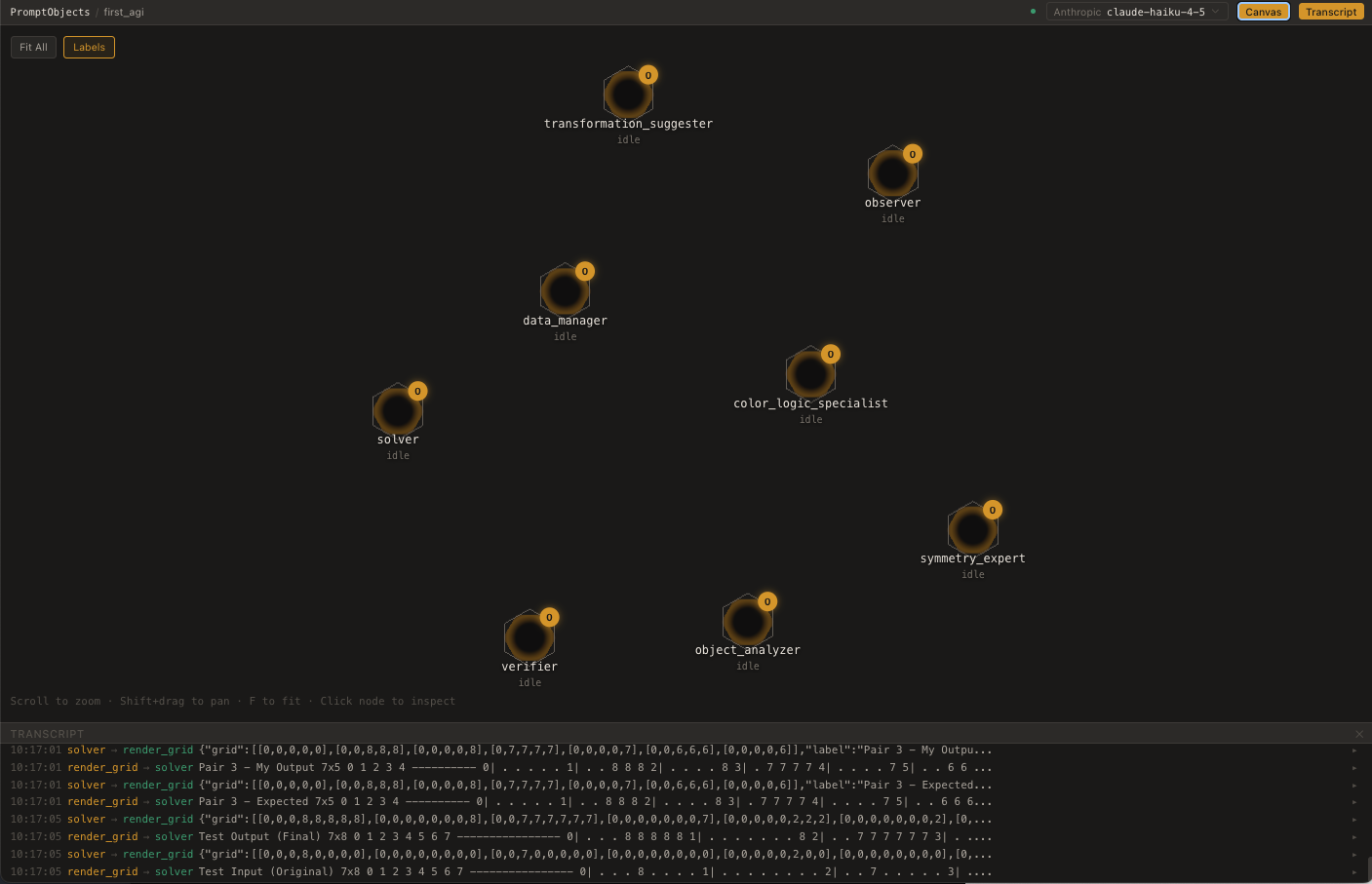 What prompt objects gives you is a way to easily model the process. Maybe you want a hypothesis object to propose a rule. A tester object to check it against the examples and explain why it failed, not just that it failed. Sometimes an object might realize it needs help and creates a new object. The reasoning is the conversation.