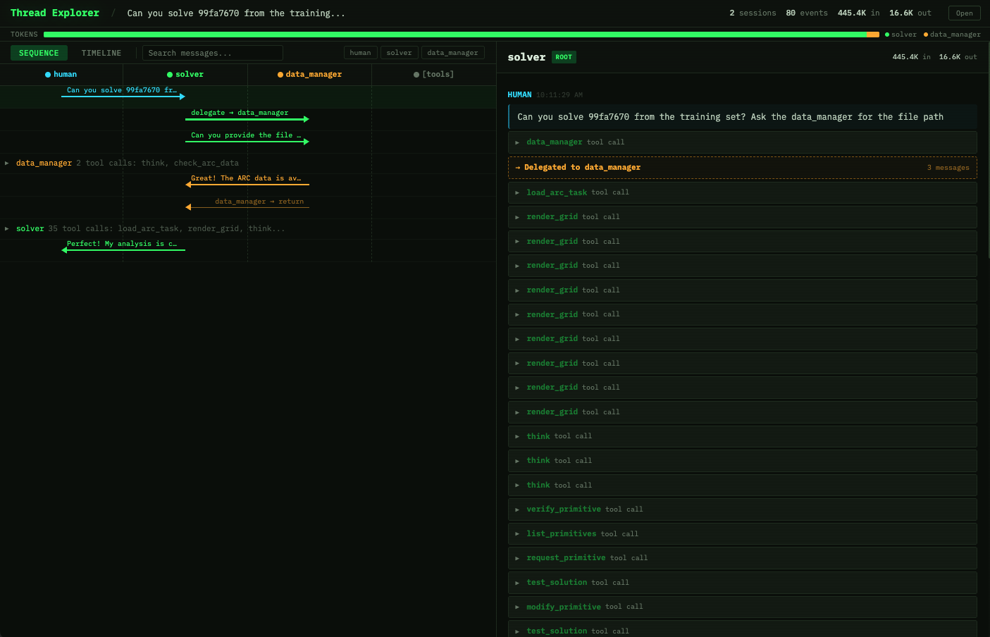 My whole solver is absurdly simple to read. You can trace through an execution and understand it in minutes. Compare this to a typical agent pipeline: hundreds of lines of orchestration, retry logic, guardrails, fallback chains. Or look at competitive ARC-AGI approaches: test-time training pipelines, program search over thousands of candidates, and so on. Entire infrastructures built to compensate for the brittleness of the underlying architecture.